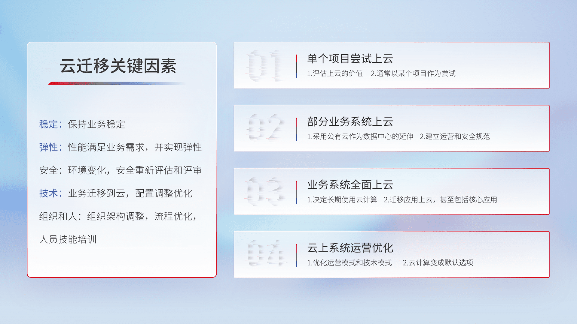 结合实际业务,,,从规划设计、、云平台选型、、、云原生改造、、、数据迁移、、、、集成交付,,,迁移全过程为客户识别最佳上云路径,,做好风险识别管理,,设计网络架构、、、、身份权限、、、安全审计合规、、操作审计、、、、日志审计、、、、监控告警策略、、、多站点容灾设计等,,对云上基础设施进行整体规划,,,,提升IT治理水平,,,,以满足弹性、、高可用、、、高性能的需求。。。。