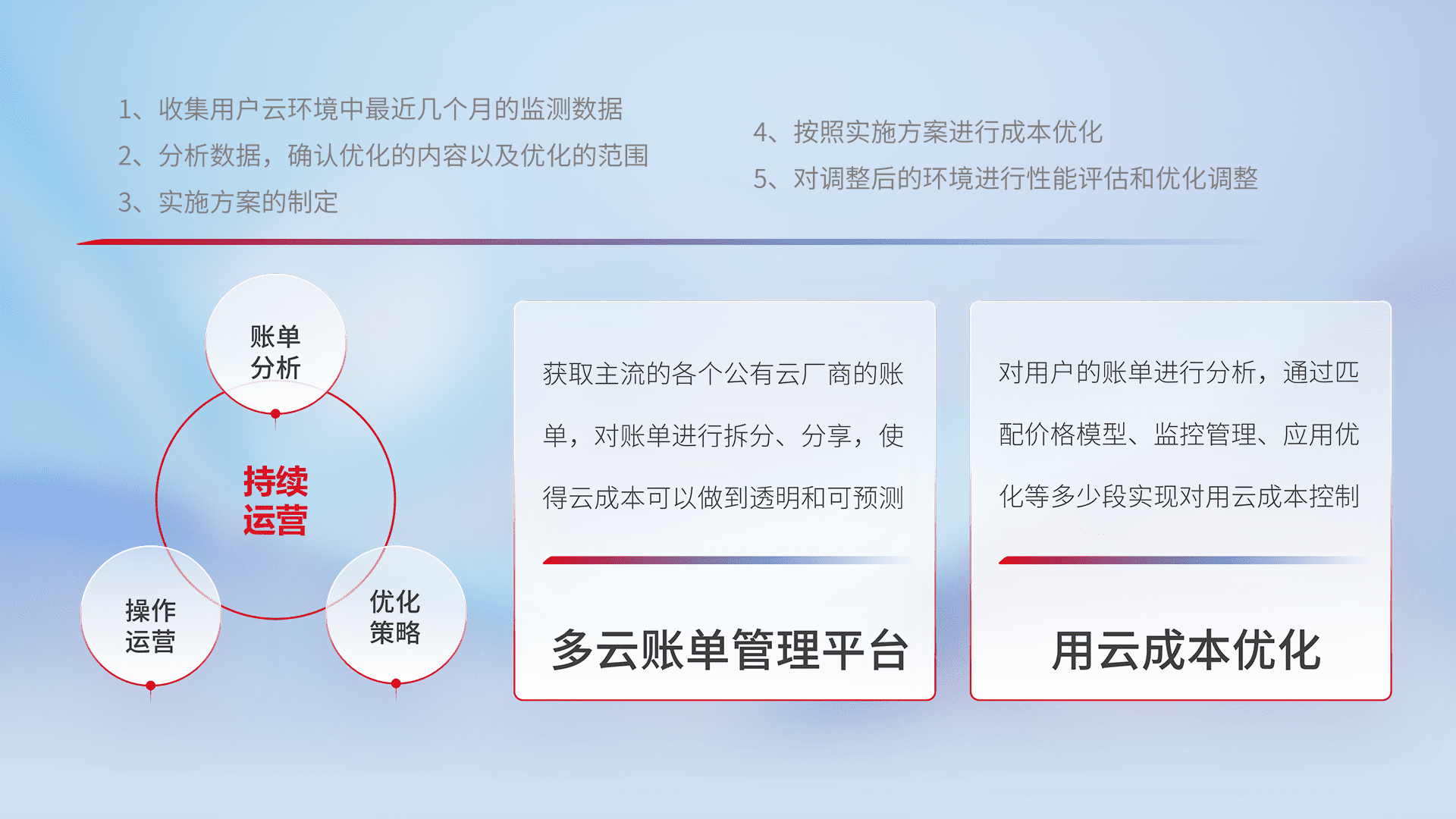 通过多云纳管,,以统一的资源数据模型把客户的云资源进行抽象和封装,,进而实现对多云资源的统一操作,,,,保障云资源管理的可靠性、、稳定性与可用性。。量身定制化运维内容,,配置、、、、开发运维、、、、补丁管理、、、、备份、、、、监控、、认证和访问管理、、、、审计和日常巡检等,,保障在用云过程中的可靠度,,,稳定度以及高可用率。。