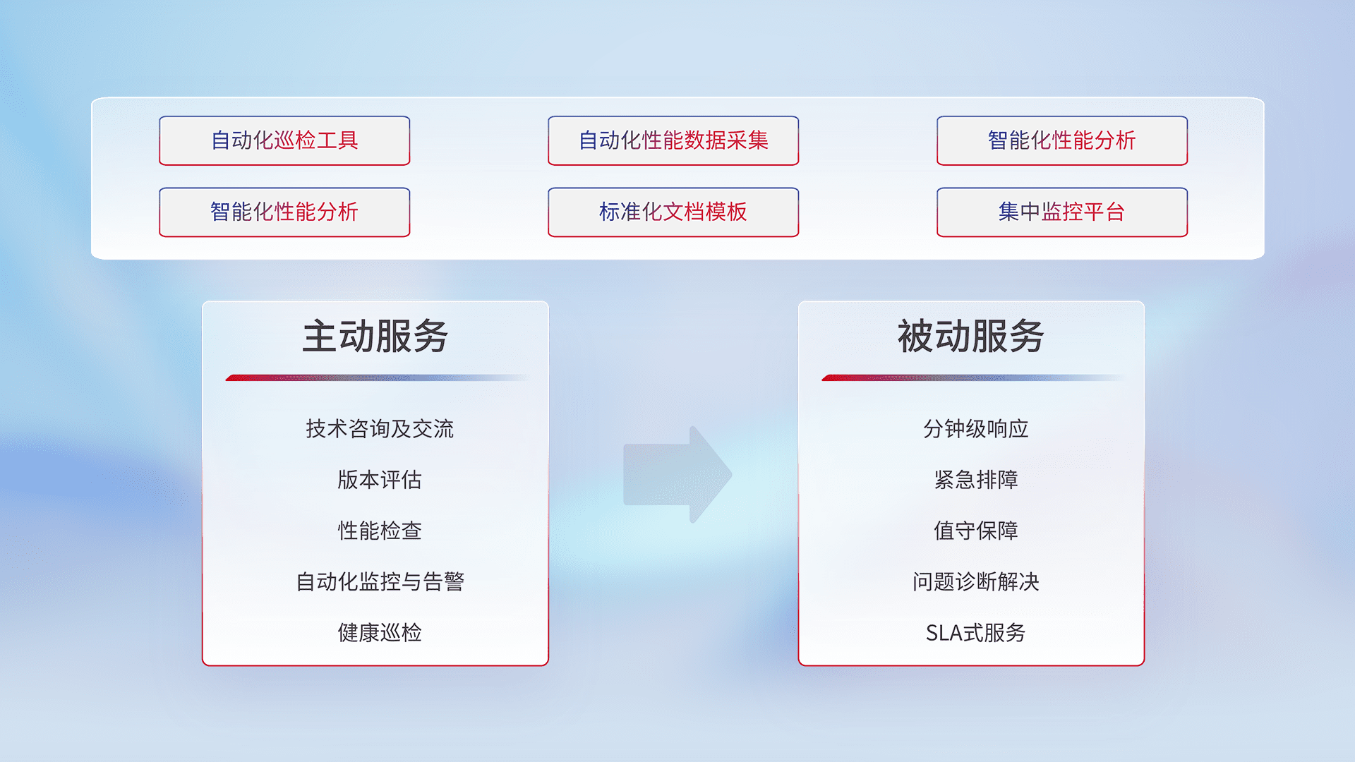 智能化工具和标准化文档,,,,保障服务质量,,,提供主动服务(包含技术咨询、、、、版本评估、、、、性能检查、、、、自动化监控与告警、、、健康巡检)和被动服务包含(分钟级响应、、紧急排障、、、、值守保障、、问题诊断解决、、、、SLA服务)。。