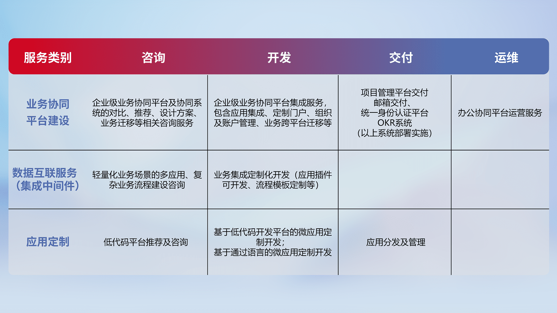 针对钉钉、、、企微、、、IDaas等平台级产品提供产品的规划、、方案、、交付、、、、定制化开发等服务,,,实现如统一协同办公、、、、智能客户服务、、混合会议管理、、、、智能数据查询、、等业务场景,,实现数字化转型。。。
